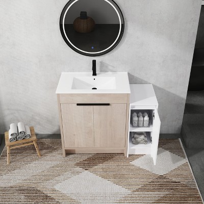 Upgrade your bathroom with this sleek and functional freestanding bathroom vanity, available in 24" and 30" sizes. This vanity set includes not only a beautifully crafted vanity with a high-quality ceramic sink but also an additional storage cabinet, providing ample space to organize your bathroom essentials. The soft-closing doors and adjustable shelves inside both the vanity and the cabinet allow you to neatly store toiletries, towels, and other necessities in a clutter-free, stylish way.