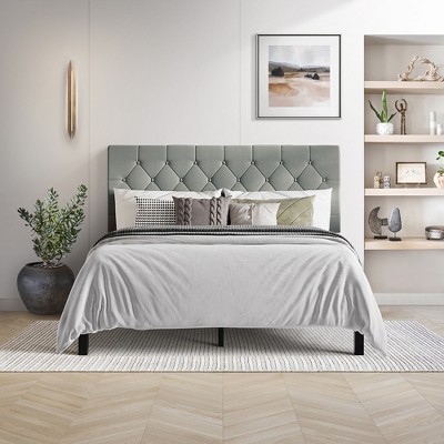 Transform your bedroom with the timeless elegance of this luxurious upholstered bed. Crafted with a solid and engineered wood frame, it features soft velvet upholstery that exudes sophistication, enhanced by crystal button tufting and a graceful wingback design. The camelback headboard, padded with foam, provides both style and comfort, making it the perfect spot for reading or relaxing. The diamond tufted detailing adds a touch of glamour, while the wingback design elevates the aesthetic appeal, creating a cozy yet dynamic focal point for your space. Available in versatile shades of silver grey, navy blue, and light grey, this bed effortlessly complements any decor and bedding ensemble. Built with a durable wooden slat system, it offers sturdy support without the need for a box spring. Conveniently shipped in one compact box with clear assembly instructions, this bed combines practicality with luxurious charm for an effortlessly chic bedroom upgrade.