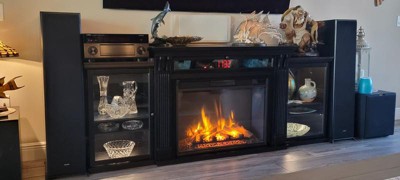 Enhance the comfort and elegance of your home with the addition of the Tracey grand electric fireplace TV stand. With an open central shelf and plenty of adjustable side shelving behind glass doors, you can keep cords and electronics organized while enjoying the inviting charm of an indoor fireplace. Part of the Real Flame® VividFlame™ Grand Series, the extra-large electric firebox mimics the look of a real, flickering fire, but does not require a chimney or vents and conveniently plugs into a standard outlet. This free-standing, oversized fireplace entertainment center can accommodate a TV up to 80". Features a mantel with a real wood finish, six flame colors, five flame brightness levels, adjustable thermostat, timer function and automatic safety shut-off. The electric fireplace insert provides supplemental heat for rooms up to 1,000 sq ft or the heater can be turned off so you can enjoy the comforting ambiance of a glowing fireplace year-round. Mantel, firebox with log set, hardware and remote control are included.