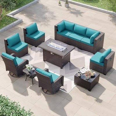 ALAULM 11 Pieces Patio Furniture Set, Rattan Wicker Outdoor Conversation Sets w/43in Propane Fire Pit Table