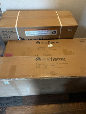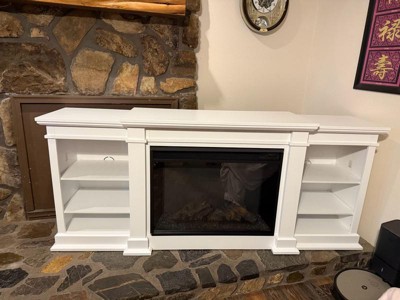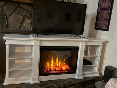 The Eliot grand electric fireplace TV stand has a fresh, streamlined design with open shelving on either side for a light, casual appeal. This free-standing, oversized fireplace entertainment center can accommodate a TV up to 80". Part of the Real Flame® VividFlame™ Grand Series, the extra-large electric firebox mimics the look of a real, flickering fire, but does not require a chimney or vents and conveniently plugs into a standard outlet. Features a mantel with a real wood finish, six flame colors, five flame brightness levels, adjustable thermostat, timer function and automatic safety shut-off. The electric fireplace insert provides supplemental heat for rooms up to 1,000 sq ft or the heater can be turned off so you can enjoy the comforting ambiance of a glowing fireplace year-round. Mantel, firebox with log set, hardware and remote control are included.