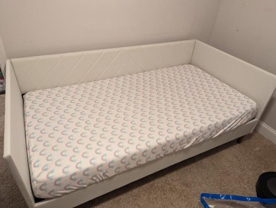 [This review was collected as part of a promotion.] I love the sleek and clean lines of this daybed that borrows inspiration from a modern mid-century aesthetic. Plus, it offers the ultimate in multifunctionality: It is a sofa by day and a sleeper by night. It is crafted with a steady wood frame that includes a robust interior metal support railing and stands on slightly tapered metal legs in a matte gold hue. The system of wooden slats supports your mattress of choice and won’t require an additional box spring or foundation. It is recommended you get a mattress 8” thick. The slender space-saving silhouette, shelter arms, and posh chevron pattern tufted backrest are upholstered in a soft gray, linen-like fabric that complements nearly every color scheme. The DHP Alicent Twin Upholstered Daybed will leave a lasting impression whether it be in your living room, home office, or a guest room. It arrives in one easy-to-handle box that contains all parts, tools, and instructions for easy assembly.