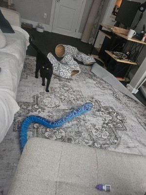 Soft, easy to unpack, no steaming, no creases. Its a little bit darker green than the photo online, and my photo makes it look grey, there is some gold hints in it upclose and depending on the light it changes. So thats cool! My cat loves it and he hopes you like his snake in the Pic. ✨️😎 would recommend this rug completely.
