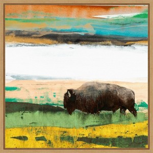 This artwork features a bison roaming across an abstract depiction of grasslands, with vibrant earth tones and fluid brushstrokes. The painting showcases a harmonious blend of colors, capturing both the strength and tranquility of the prairie environment. The contrast of the bison against the dynamic background evokes a sense of peaceful coexistence with nature. This canvas art print was created by Sisa Jasper and printed in Waunakee, WI. It is stretched across a solid surface to resist sagging. We use only premium, high-tension canvas. Our exclusive stretching techniques hide corner folds and provide a taut canvas surface. The artwork is authentically licensed. The canvas appears as if it is floating in the frame because it has a narrow gap between the edge of the canvas and the frame. Our canvas items are individually made using traditional custom framing techniques, it has the quality you would expect from your local frame shop.