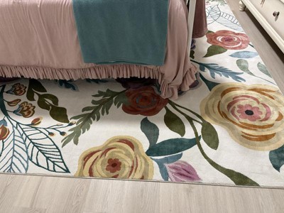 Love, love, love. This rugs color’s are vibrant and the size of the flowers will give my room a pop The rug looks like an expensive rug. It is soft, not itchy.