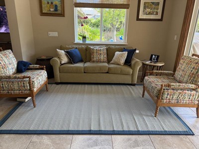 This rug sits in a sunroom and calls for an outside look. It is as pictured and the colors are true to its description, navy blue with border with an ivory and navy checkered body. I have given it a 4 star rating because it has been about a week and it still has ridges from being rolled up. I’m hoping this will resolve over time.