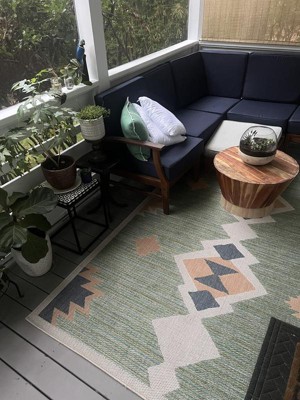 I purchased the green/blue/tan rug for my covered patio and it looks great! Love the colors, and the material seems to be of good quality.