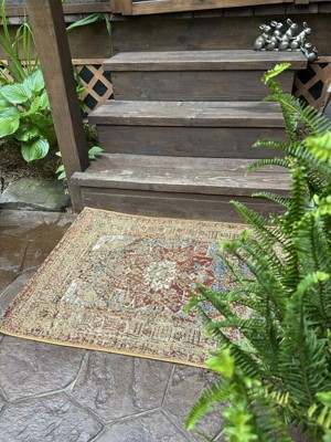 CARE: For an outdoor rug, remove debris frequently with the use of a broom or blower. To wash, spray the surface with a soap and water mixture, then rinse thoroughly with a garden hose and hang over a railing to dry thoroughly. Rotate for even wear.