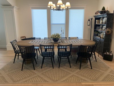 I love this rug! It fits perfectly under my long table that seats 12. The chairs glide out easy across the rug. It’s a warm tan and black design.