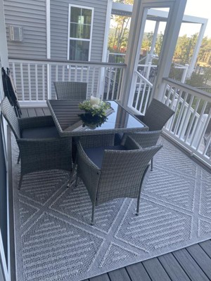 Perfect size and color for under my grey wicker porch dining set. Great quality rug!