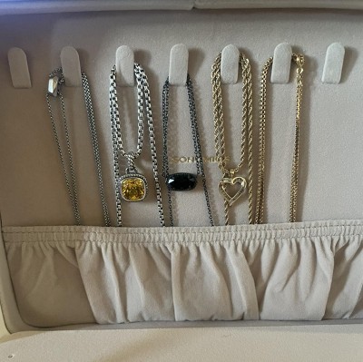 - Ample Specialized Storage:Measuring 6.9"D x 8.7"W x 4.3"H, this roomy jewelry case features multiple compartments. The lid has hooks for long necklaces, the bottom layer is suitable for sunglasses, and there's a removable earring board to neatly organize various accessories.