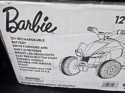 Barbie 12V Kids ATV Ride-On with Rechargeable Battery, LED Headlights, Easy Start, Durable Wheels, Forward & Reverse, Comfy Seat
