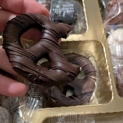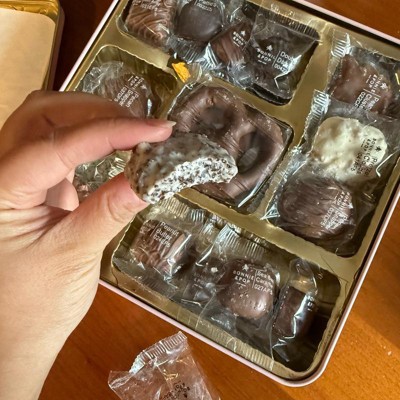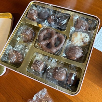 The chocolate gift basket is beautiful in person! I love the fact that each chocolate is wrapped individually allowing for easier options to share amongst a crowd without worrying about someone touching all of the candies. There are so many different flavors there is something for everyone. The chocolate pretzels are also gigantic and delicious. The container was shipped on ice and was packaged perfectly to ensure nothing melted nor was damaged. Overall a delicious set of chocolates in a beautiful tin. I’m taking one star away because I do think the price is a bit steep but the chocolates do taste great.