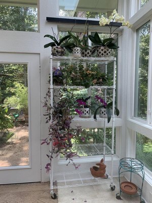 I have used this shelf two years to hold my orchid plants. They are very heavy after I soak their planting medium (spaghnum moss) for 10 minutes each week. The shelves have not sagged, chipped or rusted. The wheels make it easy to move when I need to sweep out dead blossoms. The white color is perfect for the sunroom. After two years use, I am still very happy with this product.