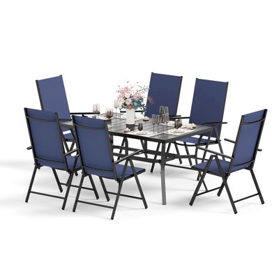 Captiva Designs 7pc Black Slatted Rectangle Outdoor Dining Steel Table & Blue Padded Textilene Swivel Chairs