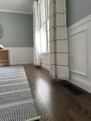 I received this rug today and I am thrilled. It is beautifully made and really pulls my open concept living dining area together. The stripe is bold and blue stripe color is true to the website. In my space it affords the perfect traditional/ modern mix. I have 6 patterns in the room and this rug works as a neutral pulling it all together! The rug lays flat ( with a few weights in the corners) and I highly recommend the heavy duty rug pad on Hardwood to prevent slippage. Thank you Annie Selki for a terrific product that can work in any room!