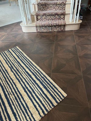 I love the texture and rustic look! It is versatile and blends in well with our more traditional staircase carpet nearby. Its slightly uneven stripes give it a relaxed vibe. It’s good because I wanted something updated, but modern wouldn’t work. It’s interesting and cozy without competing with other looks in our home.