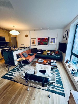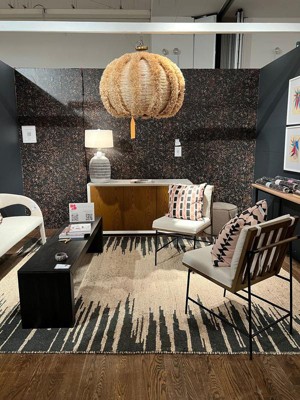I bought this rug at a HousingWorks Design on a Dime fundraiser, more as a placeholder til I found the right rug for my room. 2.5 years later it’s still on my floor! It gets compliments from anyone who comes into the room. At DOAD it was brilliantly styled with a midcentury glam vibe (photo #1, - wish I could remember the designer), and while it’s probably a bit busy for my studio (photo #2) I enjoy the soft jute/wool blend finish underfoot - no grassy prickles here!