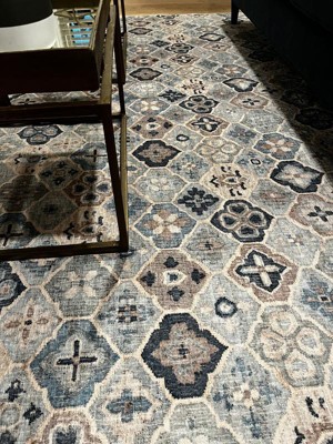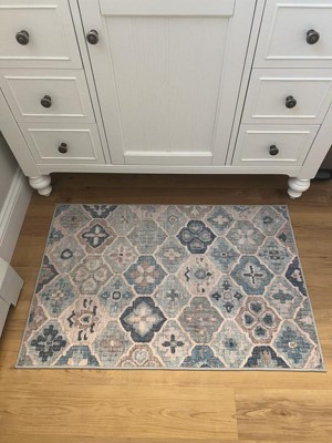 I have had my eye on this rug for several months to replace a rug that my dog has trashed. I finally bought it last week; why not? Great price, machine washable! It arrived yesterday and I am very happy with it. It’s a low profile so I used a low profile pad I had from the previous rug. The colors are fairly muted which I like. One thing to note, the pattern is smaller than I perceived from the images on the website. As you can see in the pictures, the medallions are about 6 inches square which was a surprise to me. But I still love it.