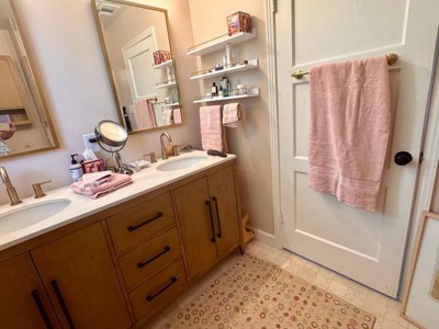 Ok so how much do I love this rug? We put in a new bathroom and I chose a neutral beige paint for the walls. When you turn the light on, however, it turns a very faint pink! GAH! Didn’t want to have to repaint, and the floor tile and shower tile were neutral beige, so saw this rug online and got some very soft pinkish towels and the rug SO pulled it together!