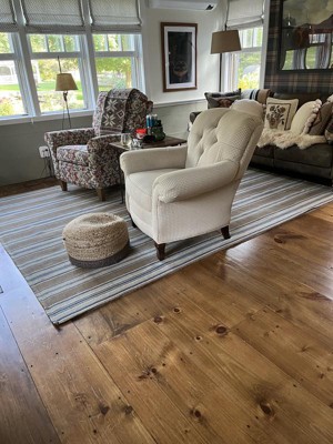 I purchased a 6x9 Blue Heron Rug. I put a good quality rug pad under it. It's in a sitting area at our summer lake house. Love the colors and the stripe. It feels great under my feet.