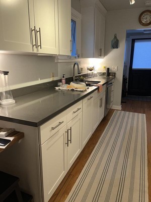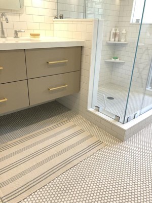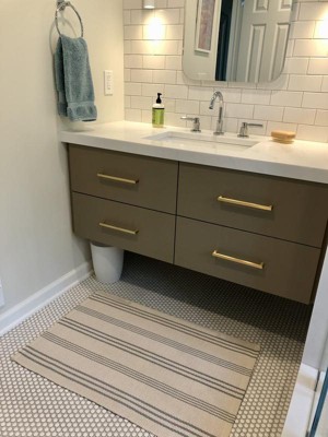 Love my Swedish Stripe Cotton Rug. The color is more of a blue/grey. Had purchased it to replace one of your rugs ( similar pattern but more blue)because my. Son-in/law dropped nail polish lt. however,I put it in my bathroom. Instead because it goes with my grey bathroom.