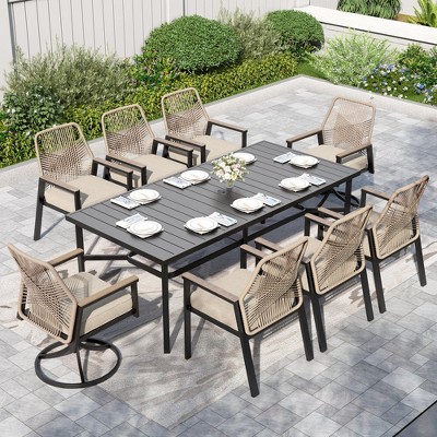 Captiva Designs 9pc Spacious Expandable Slat-top Black Rectangle Steel Table & Beige Rattan Mixed Chairs