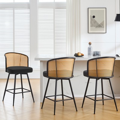 Bekrvio 26" Set of 3 Counter Height Swivel Barstools, Mid Century Modern Upholstered Faux Leather Bar Stools with Rattan Back & Wood Legs, Black