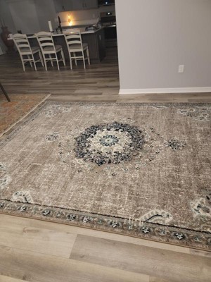 The color of the rug does not contain as much beige in it as pictured but still a pretty rug! The blue is very pretty.