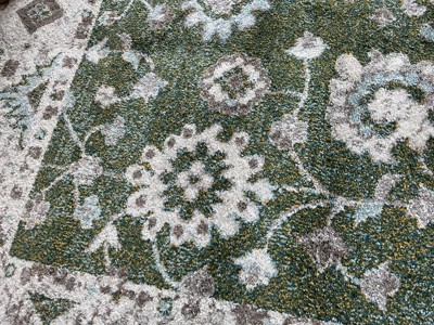 I just rolled this rug out in my living room and its very white where it I thought beige, it also has a lot of mustard yellow and turquoise yarns mixed with the green, giving it a more retro vibe - I was going for more of a classic feel for my space. Although the rug is a nice quality, its just far more vibrant and colorful than the photo.