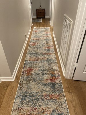Pros: Beautiful colors, soft rug, perfect length! Cons: as with all rugs, it took a long time to lie flat. I ended up putting double stick tape on the back at each end to help, and then removed it when it stayed in place well (2 weeks later).