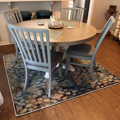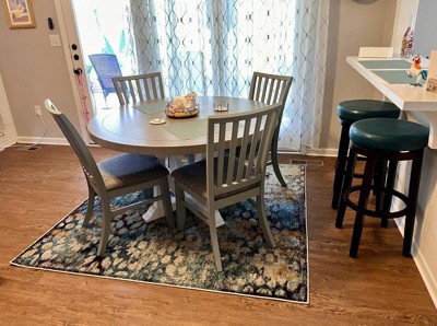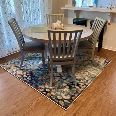 This is exactly what I needed for my dining area. The colors are not too bright and the teal mixed in with the blue and orange goes with my table with light green chairs very nicely. There is a counter with two stools on one side of the table and then the doorway to the porch on the other side. I couldn't have a large rug because it would look out of place in that small area. My table is 54” diameter with four chairs, I needed something with a small footprint. The 6’ square rug is perfect because the corners give me that little bit of extra space to allow the chairs to come out and still stay on the rug. There’s also enough space near the counter for the bar stools to pull out and be sat on without being partially on the rug. The rug arrived yesterday and it already lies flat for the most part. I reverse rolled it after opening the packaging, and after unrolling it again I weighed it down on the edges. I would shuffle across it every time I went by so that I could try to smooth out the areas that weren’t lying flat. The j ky thing I’m not a fan of is that the boarder stitching is much whiter than it appears in the photos. The boarder looks almost light green in the rugs.com photos, but I’m not taking off a star for the color being different than expected.