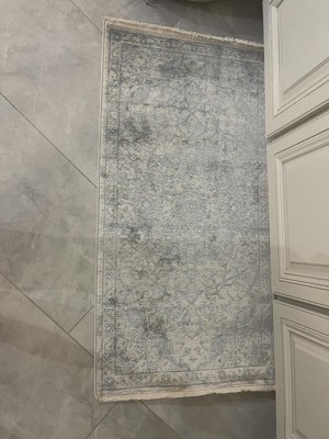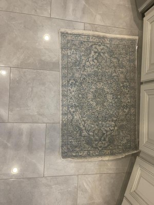 I’ve had some issues with this rug. I’ve vacuumed it twice but the fibers lay flat in a way that actually changes the color. It’s much more a dull gray than the photo, and the blue lines also become a flat grey. Additionally, there is a large, rectangular card stuck to the back, which is fine. However, after being rolled tightly in storage over time, it has left a large rectangular impression in the top of the rug, that has not been resolved with vacuuming, brushing with my feet, or time. I would not purchase this rug again.