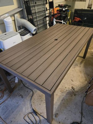 [This review was collected as part of a promotion.] This table is gorgeous. It is light, but heavy duty. It looks like real wood grain. It is aluminum and should hold up to weather. The table height is perfect and it was beyond easy to assemble. Attach four legs and you’re good to go. Highly recommend to refresh your patio space!