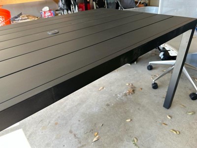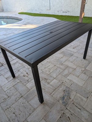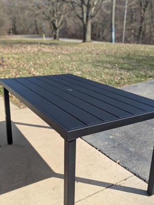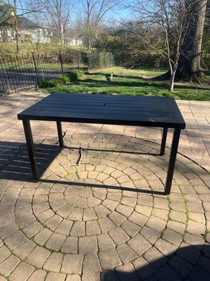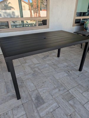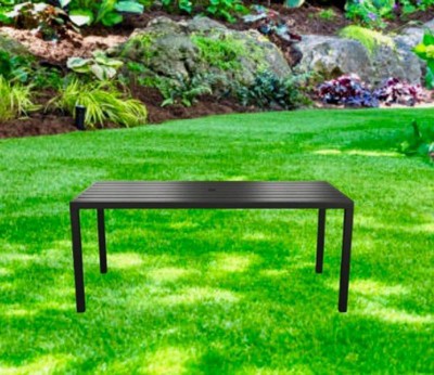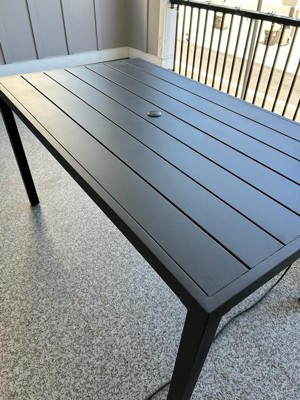 Elevate your indoor-outdoor spaces by adding this Martha Stewart Patio Table to your collection. This table for six is thoughtfully crafted with all-weather materials to deliver durability and welcome peace of mind while you dine. The sleek, powder-coated metal frame with a slatted top showcases an eye-catching aesthetic that will take your presentation to new heights. An umbrella hole with a removable cap makes it easy to pair this piece with your favorite patio umbrella and enjoy serenity in the shade (umbrella not included). Part of our Lily Pond collection, this patio table pairs wonderfully with the coordinating chairs, loveseats, and tables, crafting a custom collection that fits your entertaining maintaining this table's elegant appearance is just as easy.