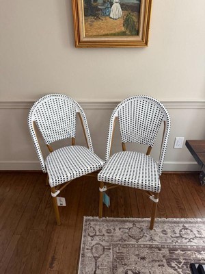 [This review was collected as part of a promotion.] I love these new bistro chairs. They go so well against my white siding I couldn't be happier. They are very sturdy, stackable and woven rattan, all things I look for in indoor/outdoor furniture. They are extremely comfortable and made with quality material. They have held up well in the weather! I am very happy with this furniture.
