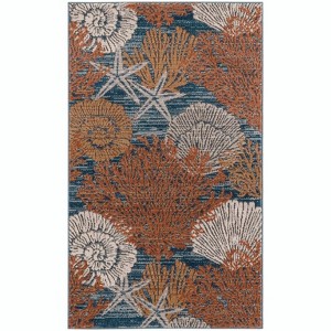 Transform your space into an oceanside getaway with this Pompeii Collection rug. Featuring coral and seashell motifs in golden yellow, orange, and ivory on an undersea-inspired blue ground, this coastal rug is machine made with a super-soft, polypropylene-polyester blend in a high-low pile for added textural interest. The soft hues mix easily with contemporary, nautical, or beach house décor and will enhance your living room, dining room, bedroom, or family room. The low-shed fibers are easy to clean.