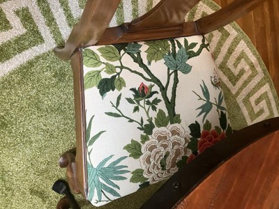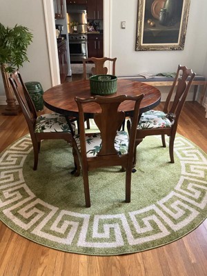 I love this rug under my small dining room table. The green is prefect with my chair cushions I upholstered. I had been looking for several weeks and was so happy to find this one. Because it was round maybe they folded it up like a rectangle and was pretty wrinkled. Put out in TX 103 degree heat on my driveway and flatted perfectly.