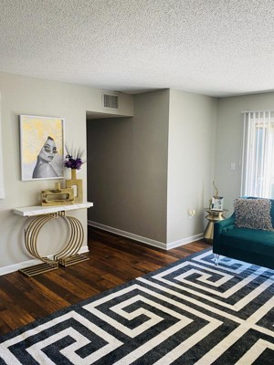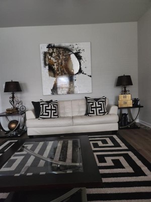 I’m loving the bold modern look. Online it looks black and white but in person it actually like a charcoal and cream. I wish the rug was fuller it’s quite flat however I Love the look of it. It works very well with my decor.