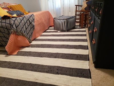 I bought this for a room makeover where navy was a heavy neutral around the room. It's hard to tell in the main pic of the rug but the cream/white stripes have threads that loom through the navy stripes. It looks good, it's just something I noticed in person that was really unexpected by almost seeing pictures. Figured I would mention it. All in all, a beautiful piece.