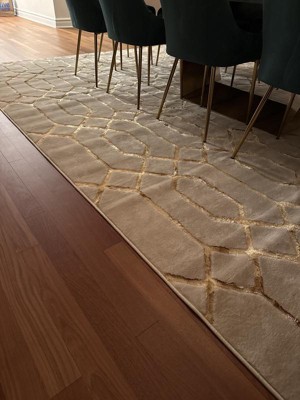 Excellent rug which arrived super quick and looks great. Got the off white and gold one and the gold part is really reflective which gives it a super lux vibe. The carpet has a nice soft thickness and nice edges.