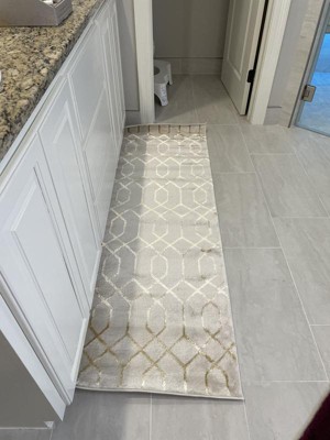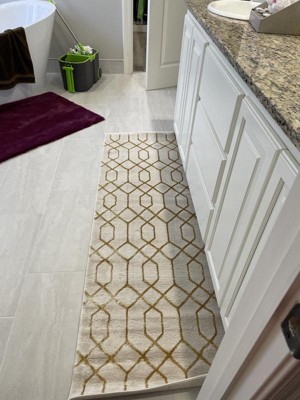 Rug was super soft and thick and really loved it from one angle only. From one end, the design was yellow and from the other it was iridescent. Also, it Ended up being more of a bone white than pure white but I really liked that. If the yellow angle would have matched better with my bathroom I would have kept it for sure bc the rug was great otherwise