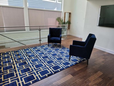 Perfect compliment for our grey walls. Color is deep blue, very attractive. The pattern of the rug adds interest. Rug laid flat immediately.