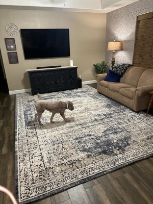 Beautiful rug with navy, beige and cream colors throughout the rug. It definitely has more cream colors than pictured.