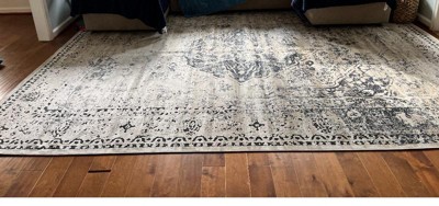 My new rug arrived quickly and just as described. The color is beautiful shades of gray, cream & navy. The gray & cream blend nicely with the greige of my walls. The rug is very thin so I purchased the thicker pad to go under it. Overall, very pleased and will definitely order from rugs.com again!