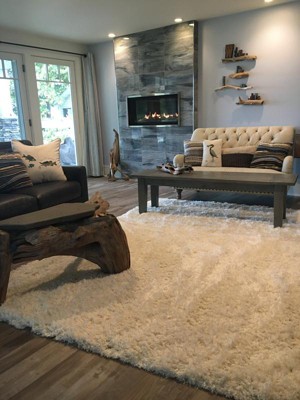 We love this fluffy rug. There’s nothing funky about the color. It’s a perfect rich cream with a nice luster. It’s varied length shag fibers give it a great casual look, just right for our modern cottage country place.