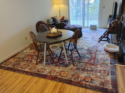 • A: The rug fits well with rustic styles, traditional floral patterns, and contemporary decor.
