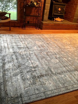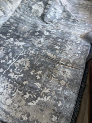 After reading the reviews, I was worried that this rug would be too dark or even blue. I was pleasantly surprised that the rug was just at the picture shows (gray, beige, & cream). There are some hints of dark gray here and there, but I was happy with the purchase as it works well in my living room.