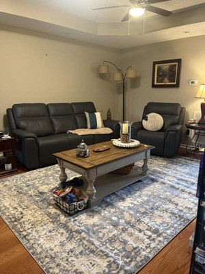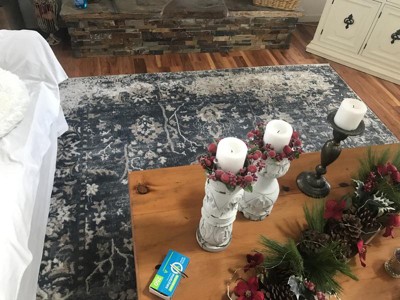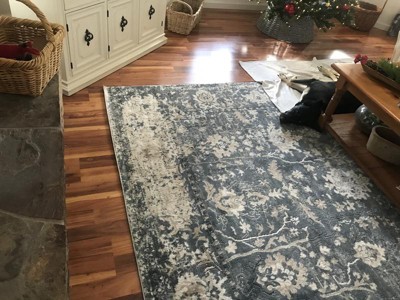Love this rug! We remodeled and out house is now shades of blue & grey. The rug looks great with the new flooring that’s brown and grey. The room before the rug was loud. With the rug the sound is dampened and it also defines the space. I went back and forth on which one to get but definitely made the right choice. The pattern also makes it look older which I like.