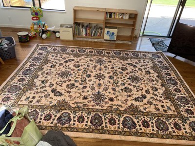 Pretty rug but very pink background unlike advertised as cream. Would send back but too much trouble and too big. Will just deal with it since it is going in a bedroom.